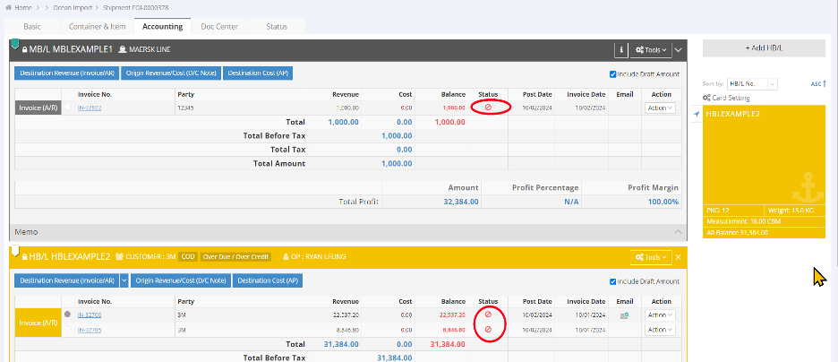 1) Shipment List (e.g., MBL List/HBL List/MAWB List): If the Status column displays a yellow lock, it means that AR, AP, or DC has been created for that shipment. To delete the shipment, you must first delete all AR/AP/DC entries related to it.