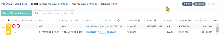 2) Invoice/Cost List: A yellow lock in the Status column indicates that a payment has been made for that item. Once a Make/Receive Payment action has been performed, the system will automatically display the yellow lock as an indicator that a payment has been recorded. To delete the invoice, the associated payment must first be deleted.