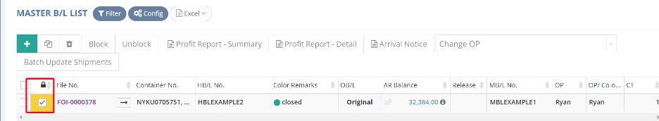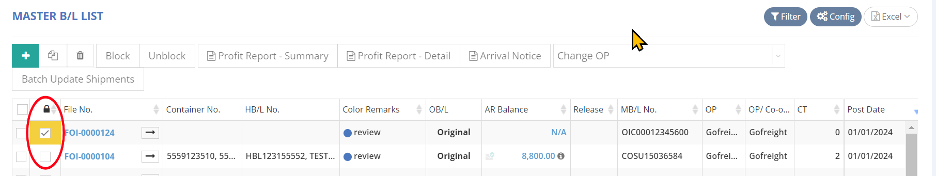 5) The MBL List/HBL List supports batch block/unblock. You can select multiple shipments or use the select-all checkbox (to the left of the black lock icon), then click “Block” or “Unblock” at the top to perform batch locking or unlocking.