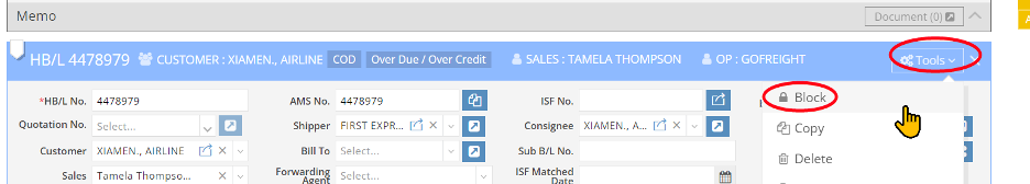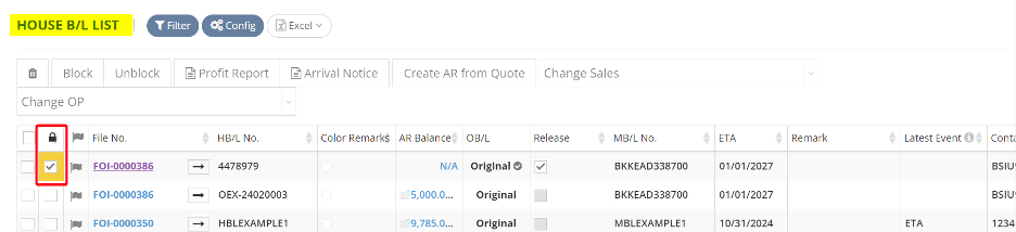 4) Please note that if you lock an item from the HBL List or by clicking Block under Tools on the HBL page, only that specific HBL will be locked. Other HBLs will remain unlocked unless locked individually.