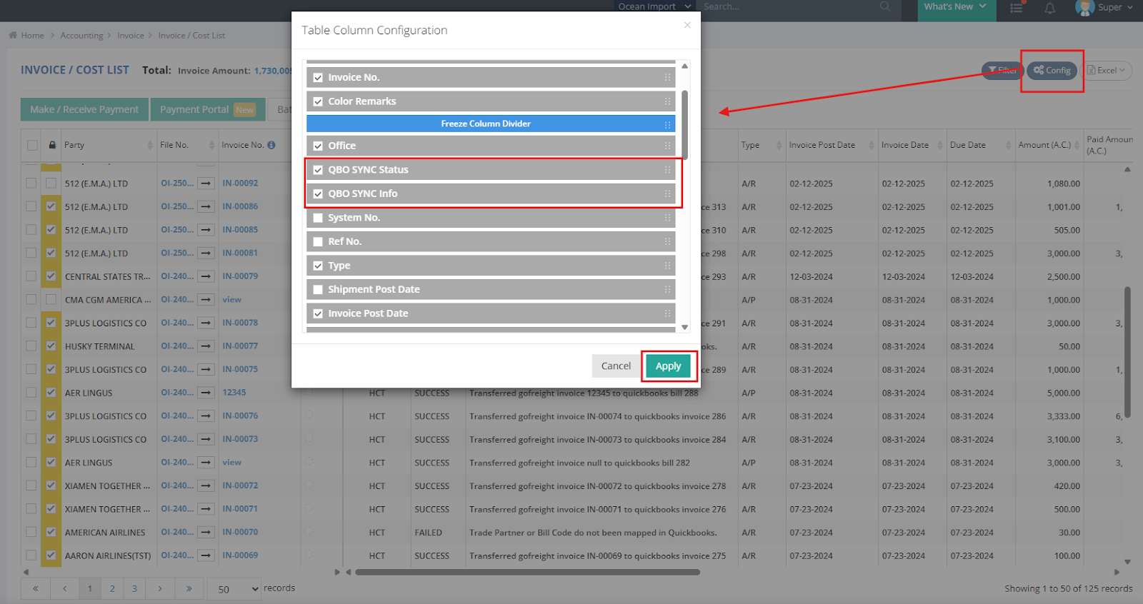 - Enable the columns QBO SYNC Status and QBO SYNC Info, and move them to your preferred display position.