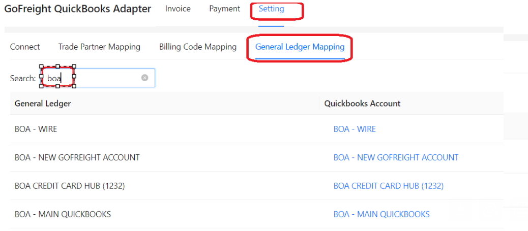 - Ensure that the bank GL codes in GoFreight are correctly mapped to the corresponding accounts in the QuickBooks chart of accounts.