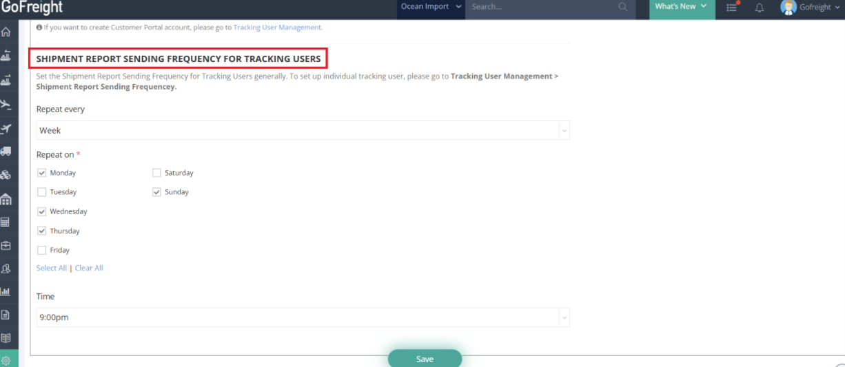 Please be aware that the "Shipment Report Sending Frequency for Tracking Users" on this page adjusts the report frequency for all tracking users (not trade partners).
