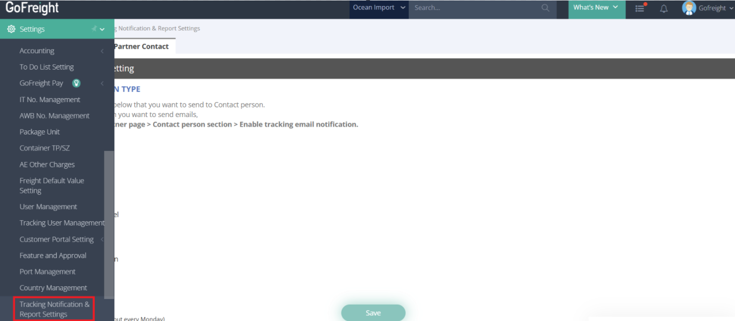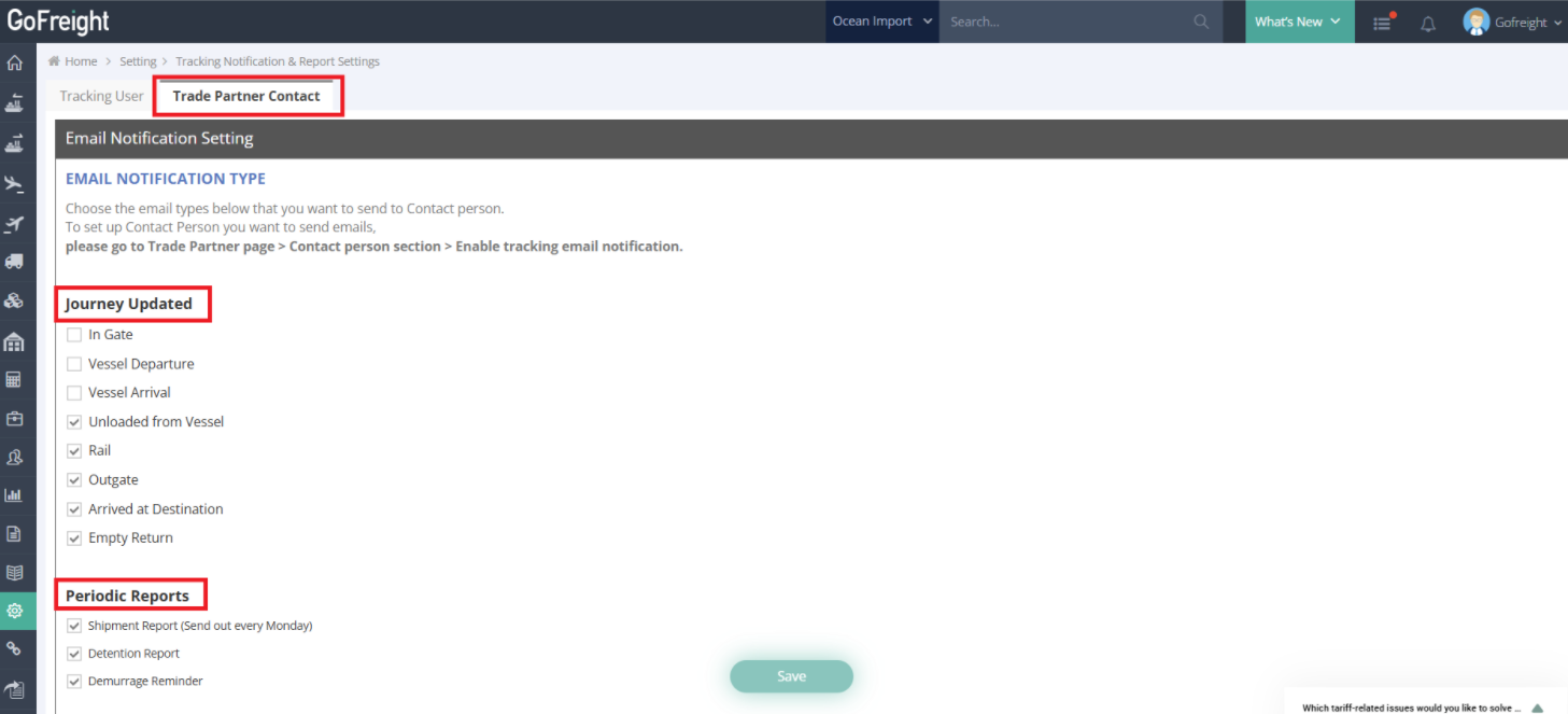 - Go to Settings > Tracking Notification & Report Settings > Trade Partner Contact tab