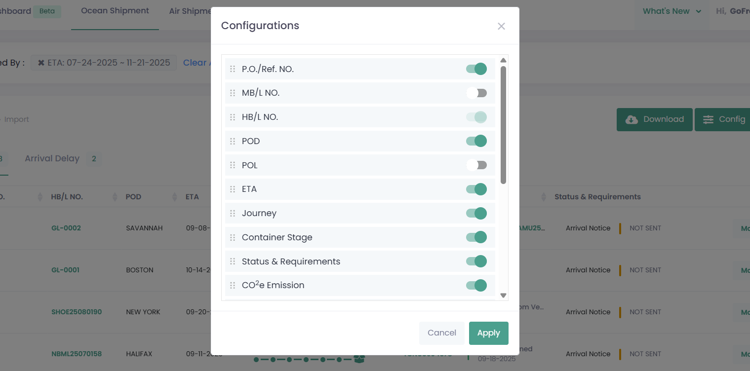- After making adjustments, click “Apply”. The changes will take effect immediately on the Ocean Shipment page.