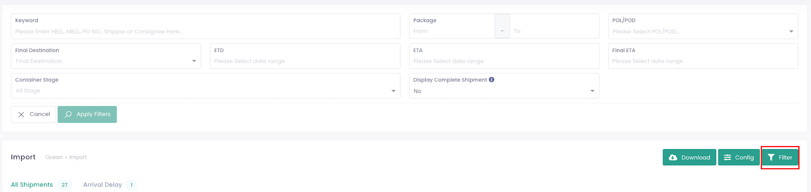 - Click the Filter button, enter key information such as shipment number, container number, or other criteria.