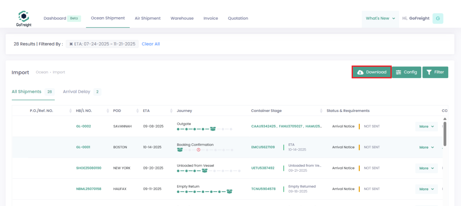 Both the All Shipments and Arrival Delay tabs provide flexibility to download shipment information, customize displayed fields, and apply filters to quickly locate the data you need.