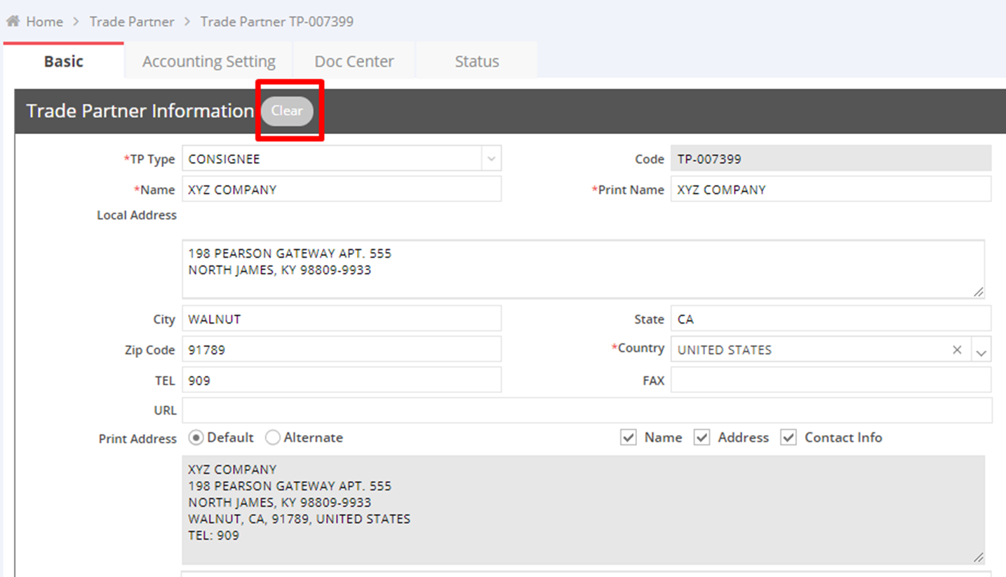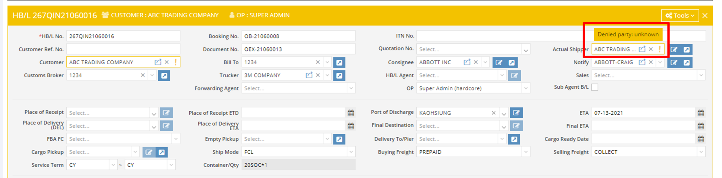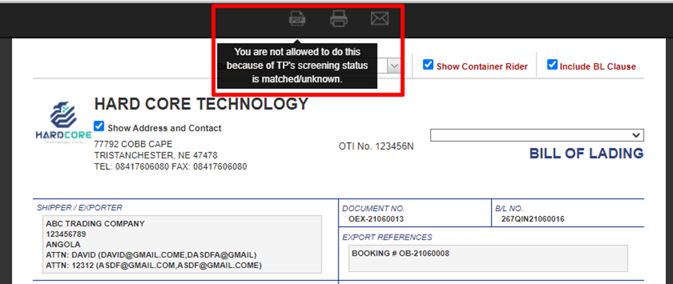 If the status of the screened party is not "Clear," the system will restrict printing the HB/L or HAWB. Printing can only occur when the status of all Trade Partners is "Clear."