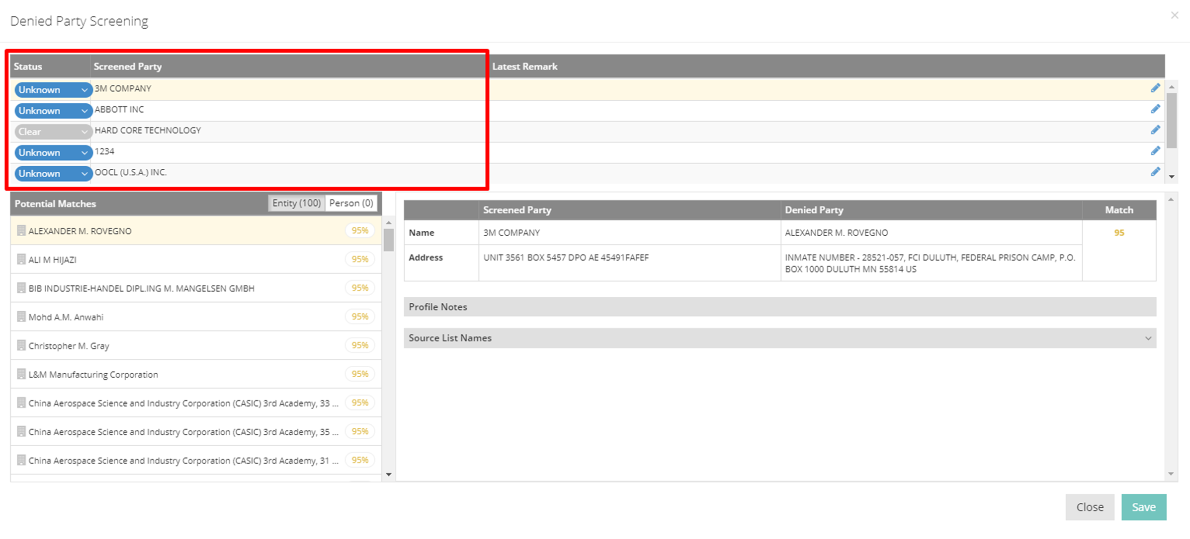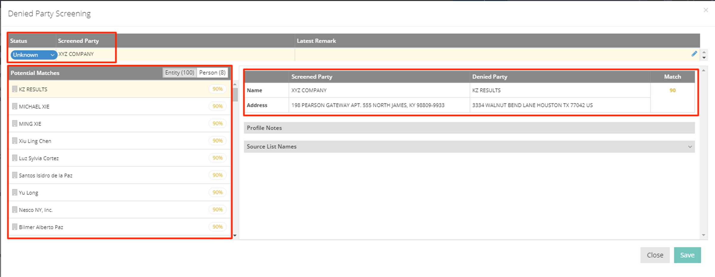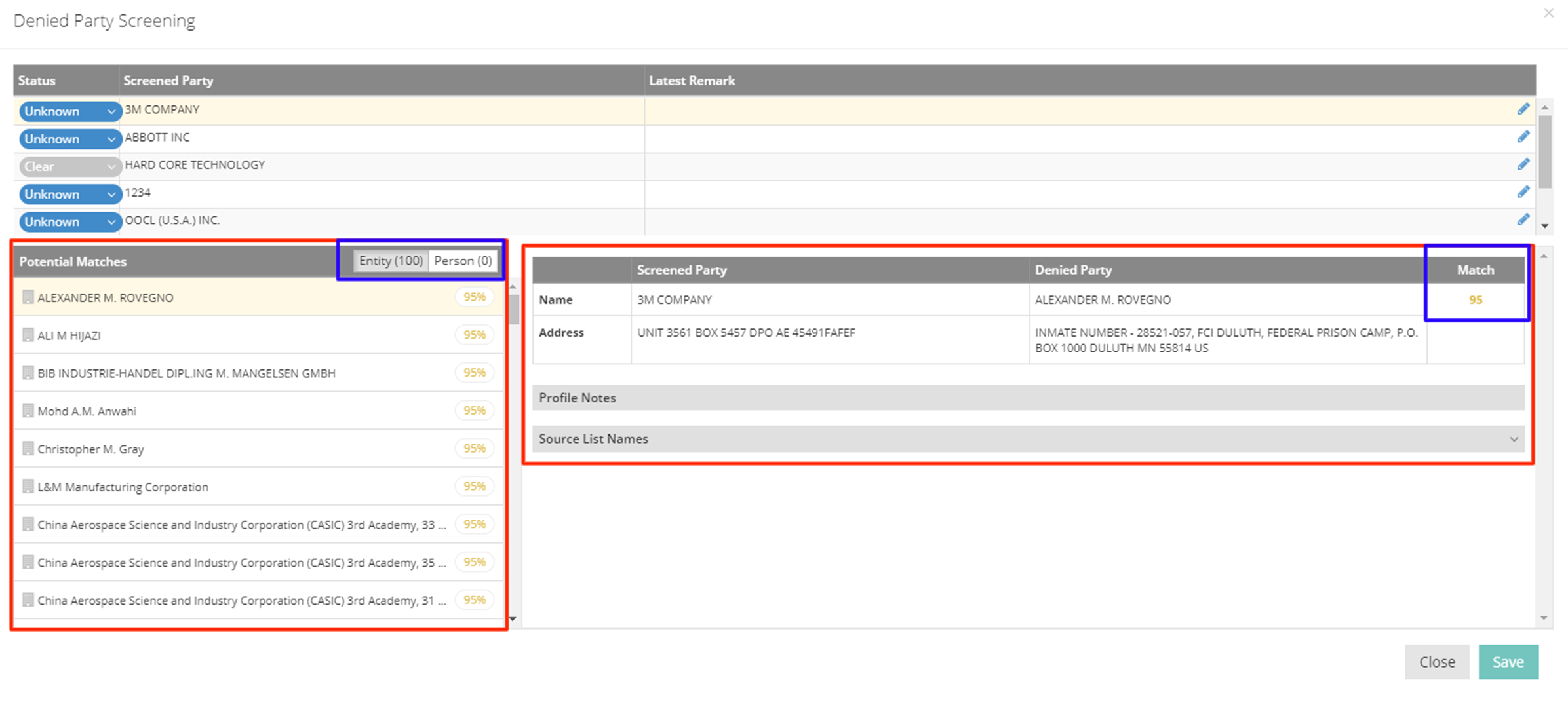 If the status is "Unknown" or "Matched," a window will pop up displaying the screening results. The upper section shows the screened party and status, while the lower left lists potential matches categorized as "Entity" and "Person." The lower right indicates the similarity between the screened party and the denied party.
