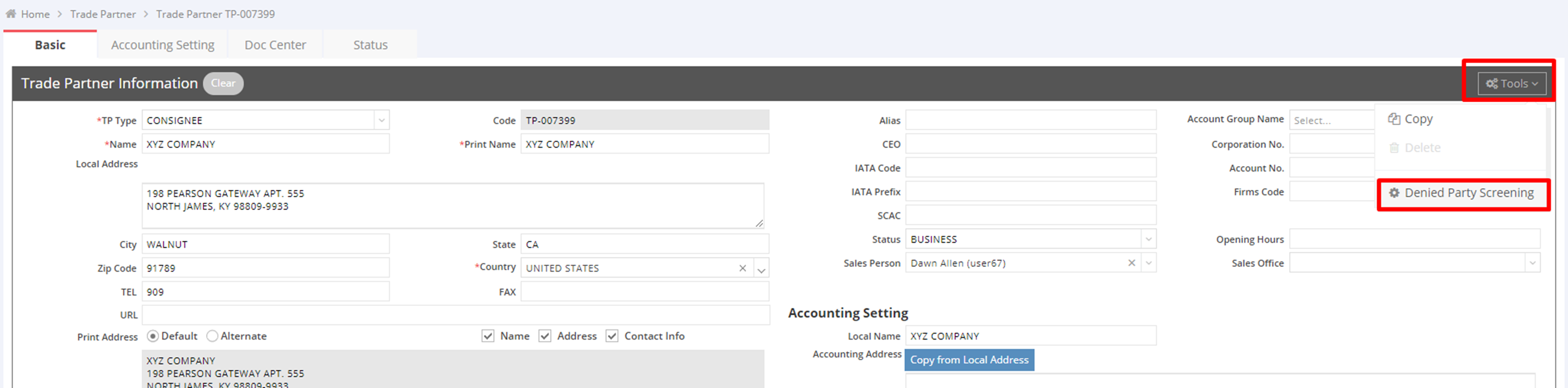 If you want to view the screening result again, click "Tools" in the upper right corner and select "Denied Party Screening."