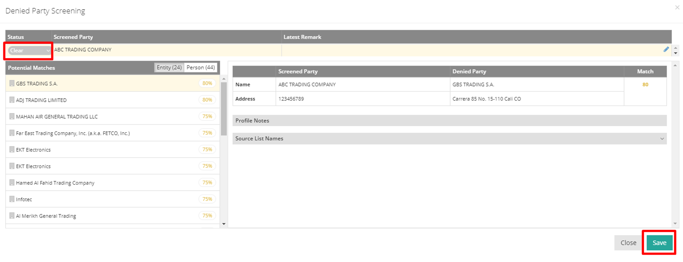 When adding a new export shipment, click "Save." The system will display a window showing the result of the Denied Party Screening.