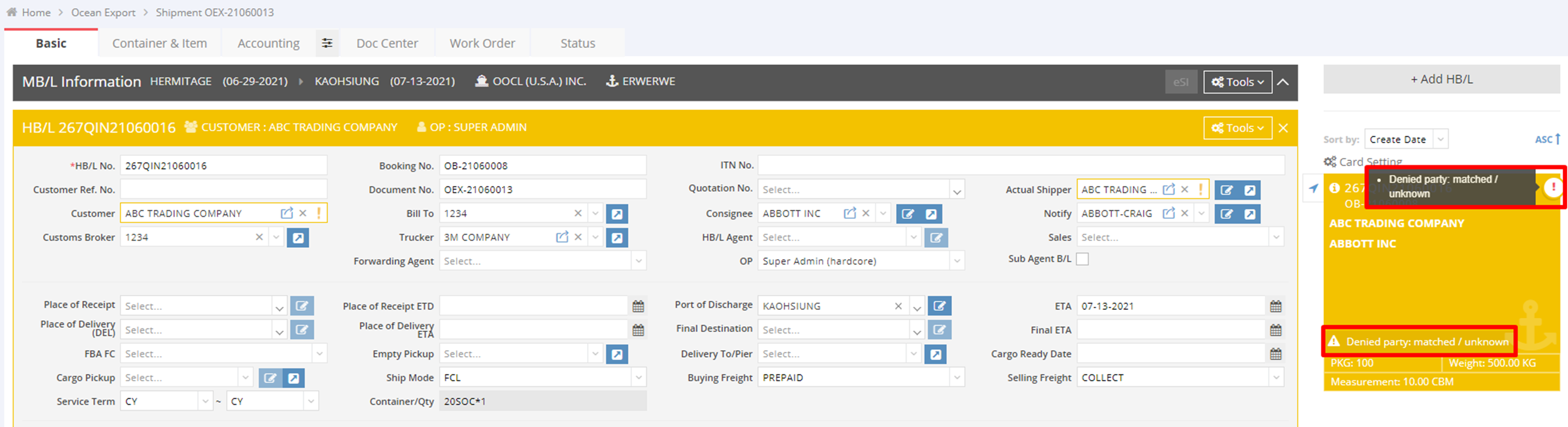 An exclamation mark will appear on the basic page to indicate which Trade Partners have an “unknown” or “matched” status. Click the yellow exclamation mark to view the screening results for that Trade Partner. If confirmed as “Clear,” the operation manager and general manager can change the status to "Clear," and the exclamation mark will be removed.
