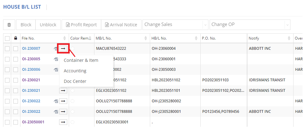 For example, in the House B/L List under Ocean Import, click the arrow icon (→) in the "File No." field to quickly navigate to pages like Container & Item, Accounting, or Doc Center.