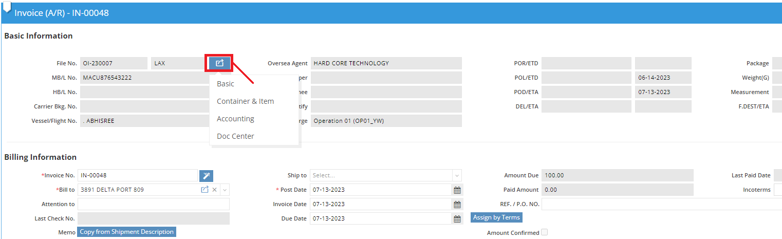 Similarly, on the invoice entry page, click the blue icon next to ‘File No.’ to reveal a menu with options including ‘Basic,’ ‘Container & Item,’ ‘Accounting,’ ‘Doc Center,’ and/or ‘Work Order.’ Clicking on any of these options will navigate you to the specified page as well.